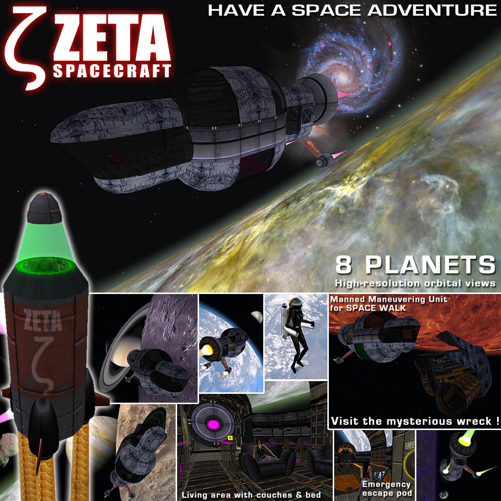 Utilisez l'orbiteur pour aller avec vos amis dans la zone la plus calme de Second Life®. Cet orbiteur de 1 à 8 passagers, atteindra l'altitude ciblée (entre 800 et 4000 m) et déployera l'Astronef ZETA et son environnement pour vous et vos invités, afin de vivre une aventure dans l'un de ces 8 environnements orbitaux: Terre, Mars, Ganymède, Thethys et 4 planètes extrasolaires.